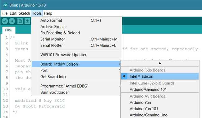 When the process is completed, the Intel Edison board will be available in the boards list.