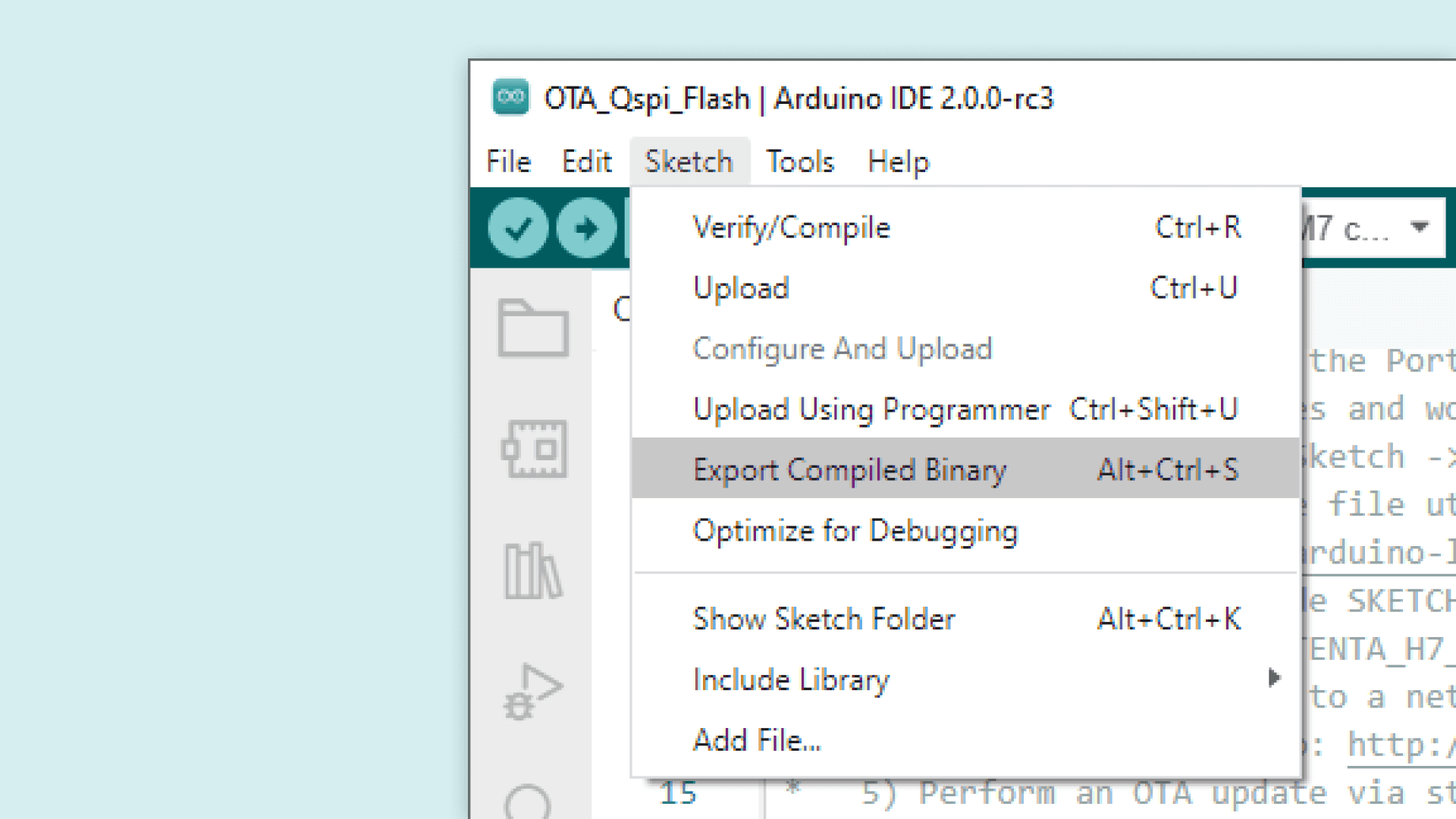 10 2) In the IDE select: Sketch -> Export compiled Binary